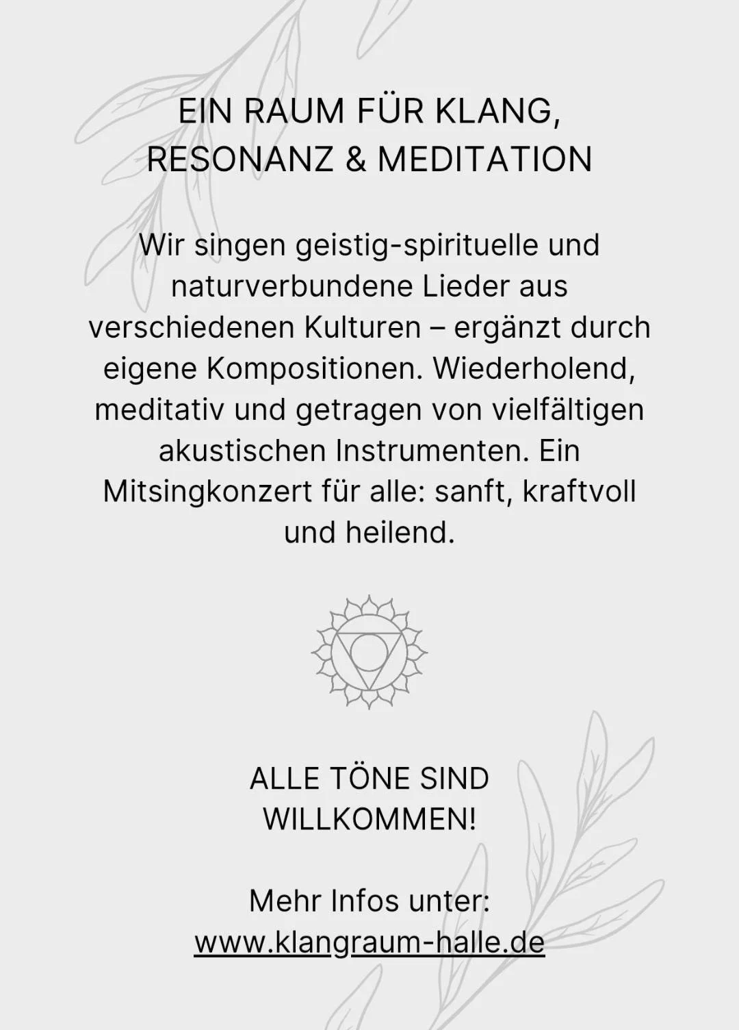Wir singen geistig-spirituelle und naturverbundene Lieder aus verschiedenen Kulturen – ergänzt durch eigene Kompositionen. Wiederholend, meditativ und getragen von vielfältigen kustischen Instrumenten. Ein Mitsingkonzert für alle: sanft, kraftvoll und heilsam.ALLE TÖNE SIND WILLKOMMEN!